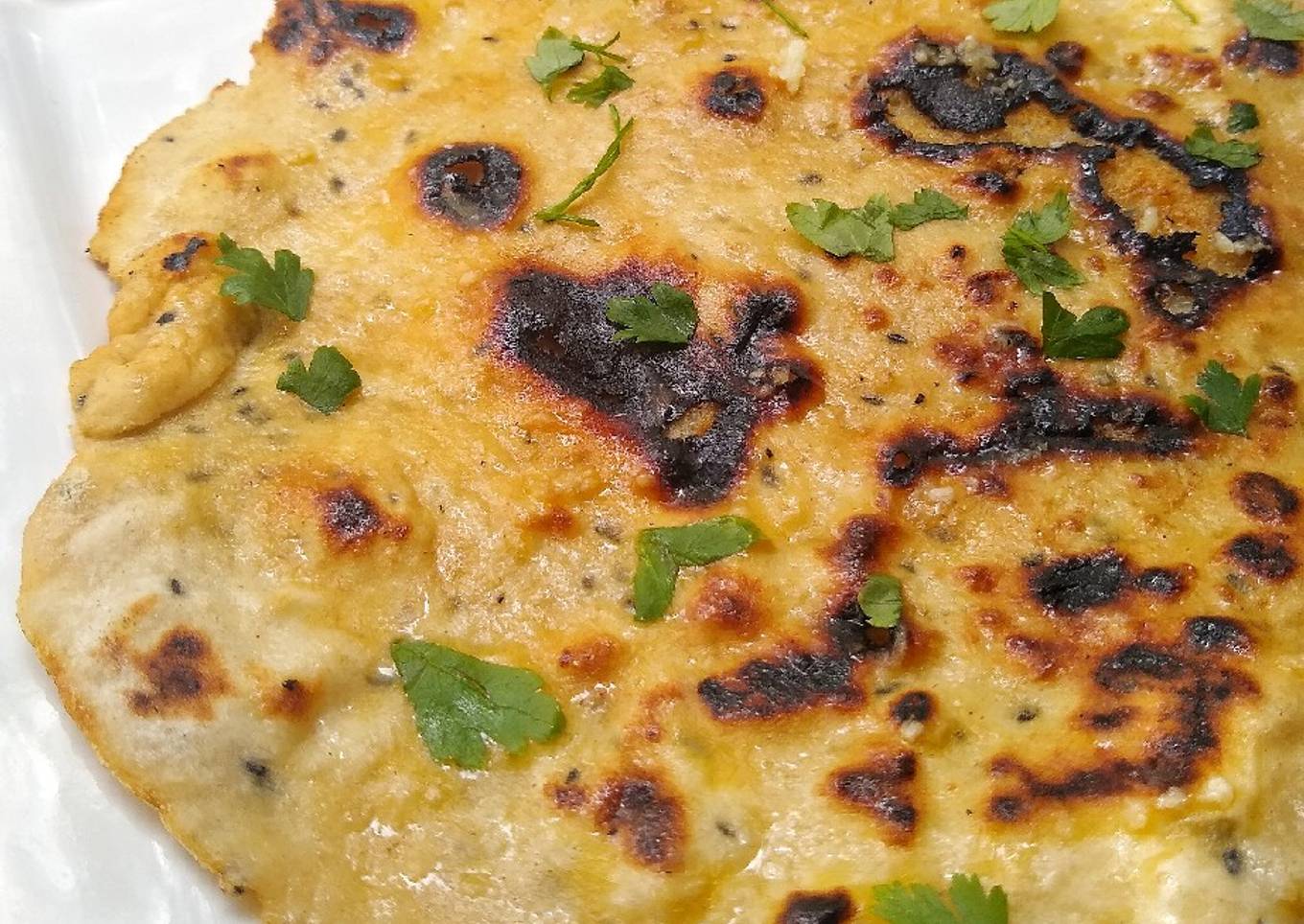 - Once really hot, gently lay in one of the flatbreads into the hot pan. Cook on each side for around 3 minutes or until golden and slightly blistered with brown circles. It may puff up a bit. After cooking each flat bread, mix the crushed garlic clove with the butter then spread it over the top of the flatbreads until melted. Garnish with some chopped fresh parsley. Eat and enjoy! :)