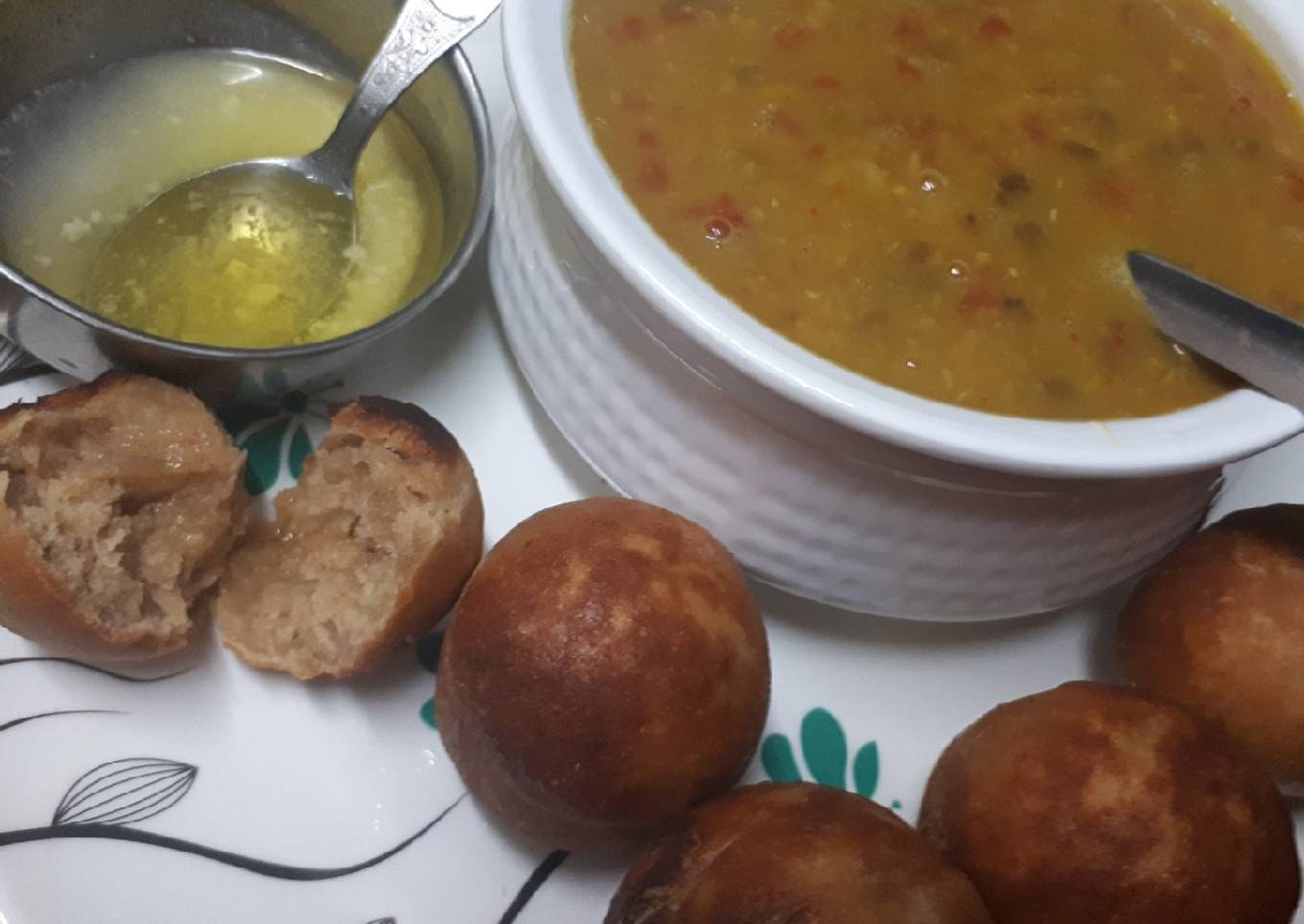 - For baatis.. in appe pan,Add wheat flour, semolina, ghee,salt and baking powder to a large mixing bowl. Mix well and yogurt to it. Mix well to knead into a semi stiff dough. 5_6 tbsp or more warm water if needed. Divide the dough in to 10_12 equal portions and shape each portion in to a ball. Heat the appe pan add grease it with desi ghee. Then put the baatis in appe pan and cook both sides untill they are golden brown. Then baatis soak cracked in ghee for a few second,drain and