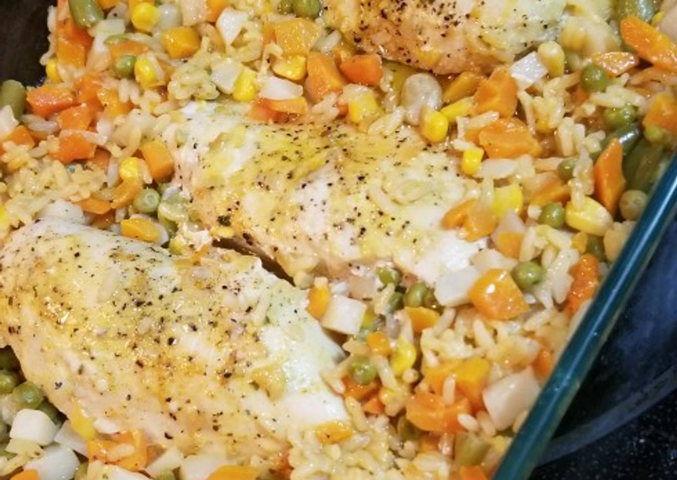 - Then pour rice evenly around chicken breasts. Drain vegetables & pour them all around the chicken breasts as well. Season chicken with salt, pepper, garlic, & dried onion.