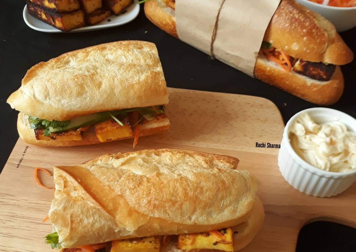 Vegan Banh Mi Sandwich made with paneer, sriracha mayo, and quick-pickled vegetables.